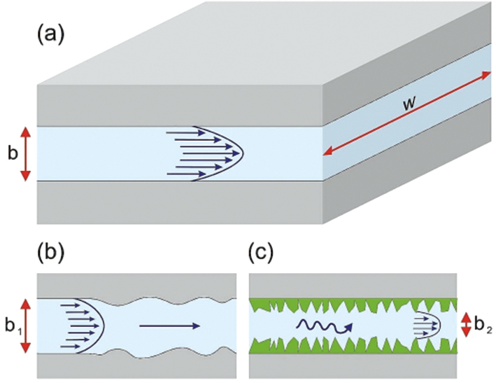 图1 裂隙中地下水流动示意图(据文献[24]) a—光滑平行裂隙中地下水(蓝色)流动,灰色为岩体基质;b—非平行裂隙中地下水流动;c—粗糙裂隙中地下水流动,绿色为局部“凸起”。