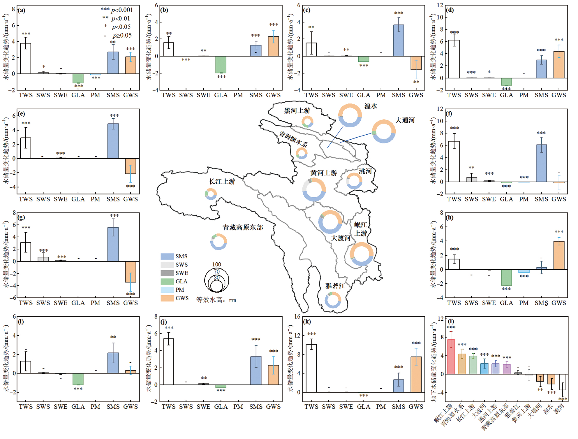 图2 2003—2022年青藏高原东部及子流域各水储量组分贡献率及变化趋势 (a)青藏高原东部;(b)黑河上游;(c)大通河;(d)青海湖水系;(e)湟水;(f)黄河上游;(g)洮河;(h)长江上游;(i)雅砻江;(j)大渡河;(k)岷江上游;(l)青藏高原东部及其子流域地下水储量变化趋势。***表示显著性水平p<0.001; **表示显著性水平p<0.01; *表示显著性水平p<0.05; -表示显著性水平p≥0.05; 环形图表示贡献率,圆圈的大小代表陆地水储量变化强度,柱状图表示变化趋势。