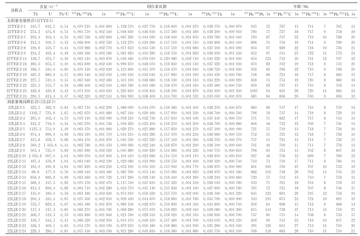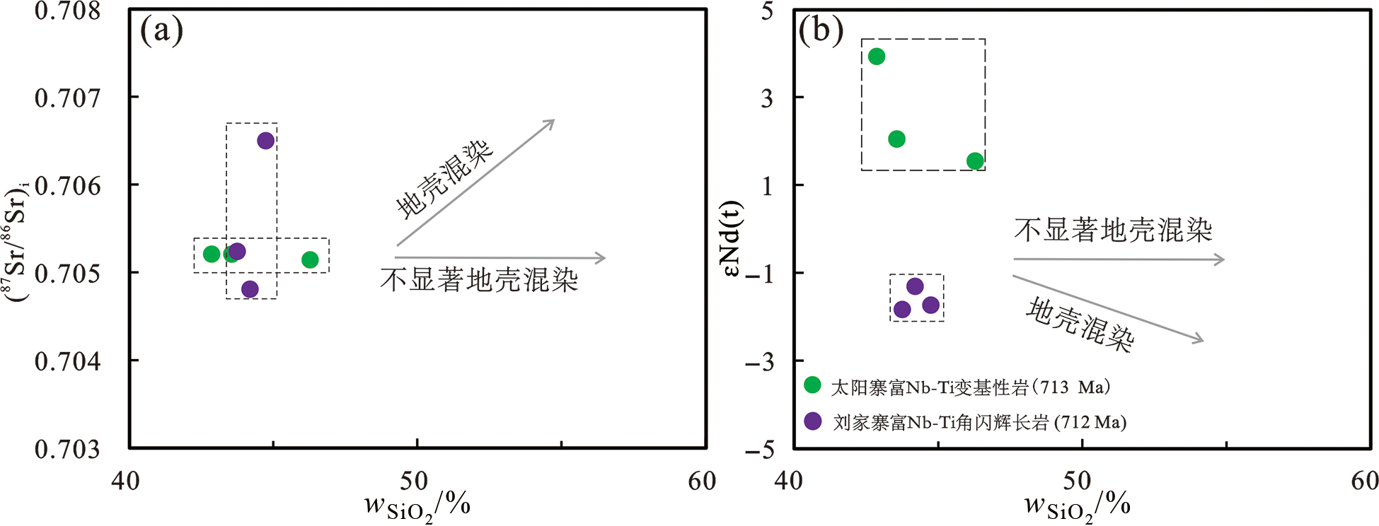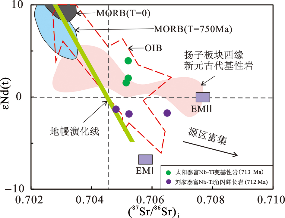 扬子板块西缘和西南缘新元古代早—中期(ca. 937~820 Ma)中-基性侵入岩普遍被认为起源于俯冲带交代地幔,然而,新元古代中—晚期(ca. 820~710 Ma)中-基性岩的地幔源区属性和深部动力学背景存在争议。基于此,本文选择扬子板块西南缘新识别的太阳寨变基性岩和刘家寨角闪辉长岩为主要研究对象,通过系统的地质年代学、全岩主微量地球化学和同位素地球化学,分析两组中-基性岩的成因机制、地幔交代作用和深部动力学背景。锆石U-Pb结果表明,太阳寨变基性岩形成于(713±6.3)Ma,刘家寨角闪辉长岩形成于(712±3.6)Ma。太阳寨变基性岩具有变化的MgO(3.3%~7.2%)、Fe2O3T(8.3%~15.5%)、CaO(11.3%~12.7%),高的TiO2(1.2%~2.6%)含量和低的K2O(0.26%~0.33%)含量,属于拉斑玄武质系列。这些岩石轻微富集LREEs,亏损HREEs,富集LILEs和Ti,亏损HFSEs。并且具有变化的锆石εHf(t)(-1.9~+1.4)值和正的全岩εNd(t)(+1.5~+3.9)值,指示了Nd-Hf同位素的解耦特征。结合较高的TiO2、Nb含量,Nb/Y(0.40~0.77)和Nb/Zr(0.13~0.18)比值,表明太阳寨变基性岩起源于俯冲板片熔体交代的地幔源区。刘家寨角闪辉长岩具有较高的MgO(5.4%~7.2%)、Fe2O3T(14.5%~16.2%)和TiO2(2.8%~3.4%)含量,较低的Mg#值(40.0~49.6)和不均一的K2O(0.5%~2.3%)含量。这些角闪辉长岩富集LREEs,亏损HREEs,富集LILEs(Rb、Pb和Sr)和Ti,亏损HFSEs(Nb、Ta、Zr和Hf)。样品具有变化的锆石εHf(t)(-0.7~+5.9)和负的全岩εNd(t)(-1.8~-1.3)值。结合较高的K2O、Nb((3.4~6.2)×10-6)和Th((0.4~1.2)×10-6)含量,较高的Nb/Y(0.23~0.33)和Nb/Zr(0.08~0.11)比值,表明刘家寨角闪辉长岩起源于板片熔体和沉积物熔体交代的地幔源区。这些中-基性岩形成于区域伸展的弧后背景,标志着扬子板块西缘和西南缘在新元古代时期经历了从早—中期俯冲到中—晚期弧后伸展的构造转变。