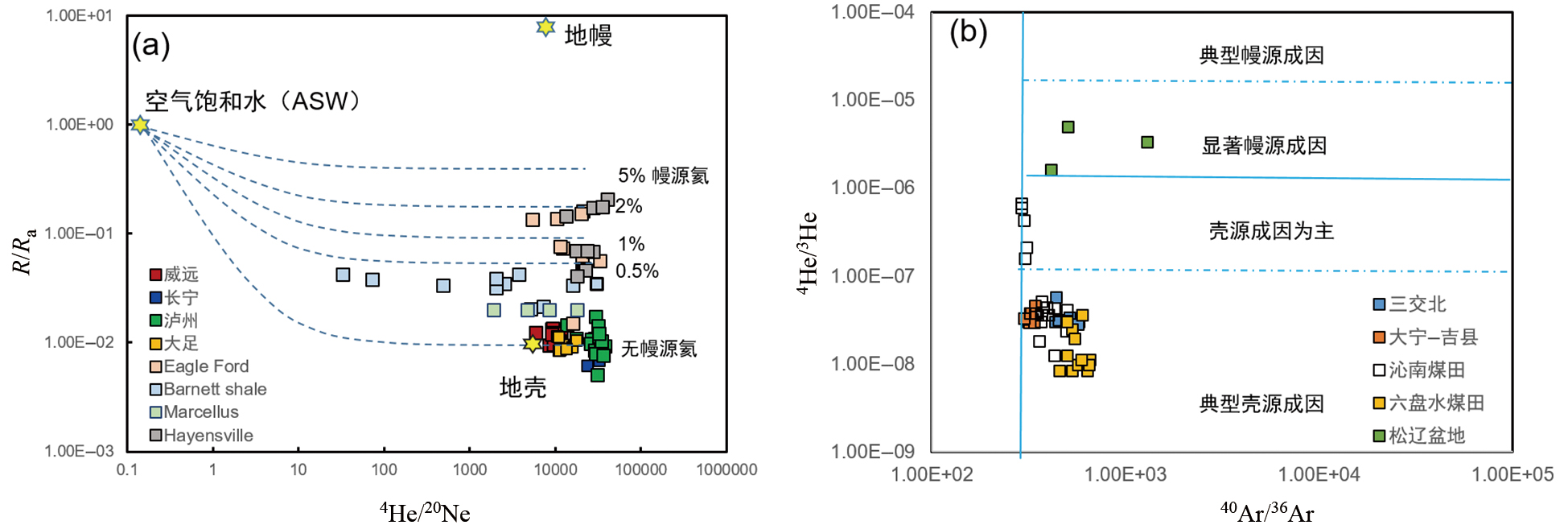 Fig.3 The relationships between R/Ra and 4He/20Ne in the shale gas in South Sichuan Basin (a) and between 40Ar/36Ar and 3He/4He in the coalbed methane in the East Ordos Basin (b)