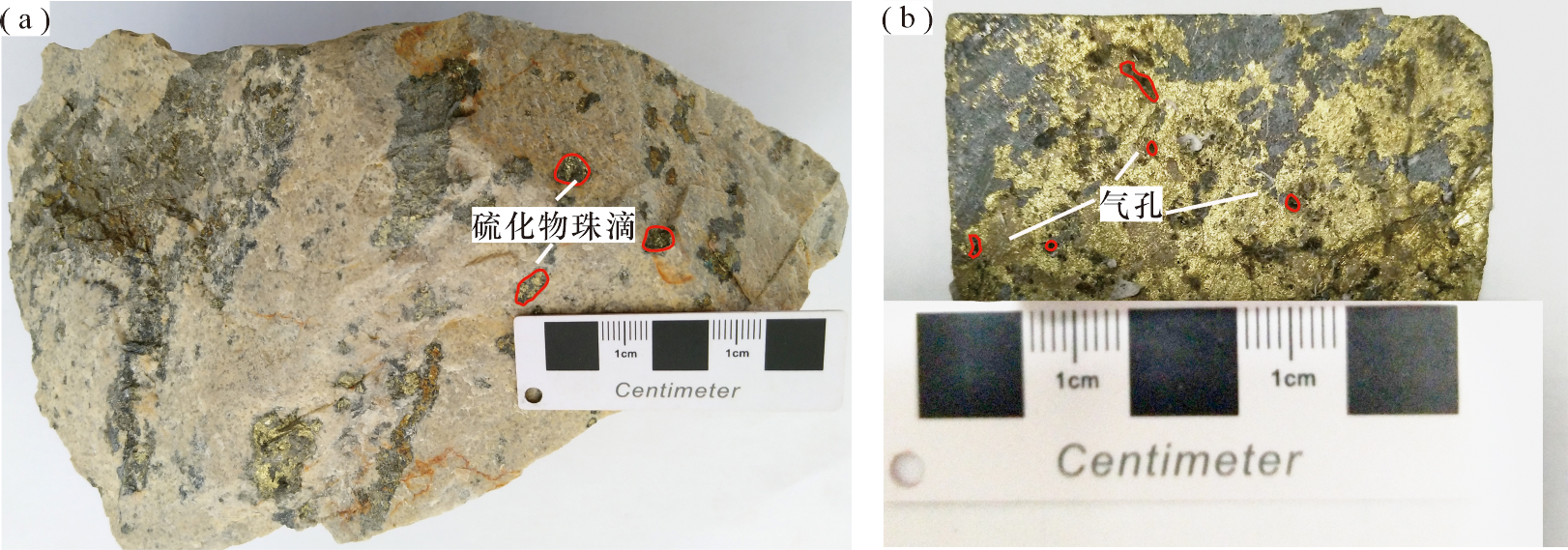 Fig.10 Hand specimen photographs of rocks and ores from the Oubulage porphyry copper-gold deposit a—Quartz porphyry with sulfide droplets; b—Ore with vesicles.