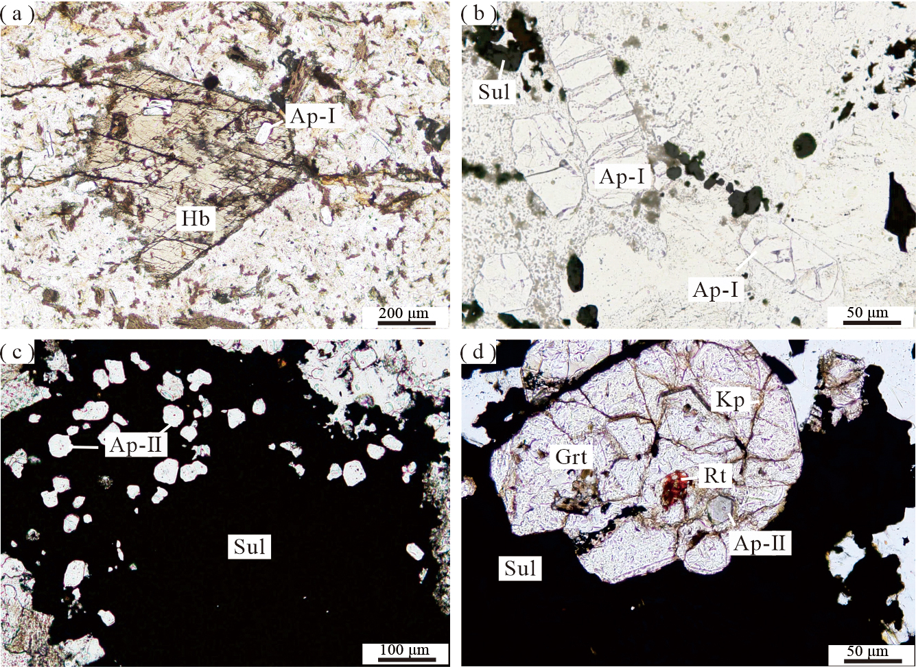 Fig.3 Microscopic characteristics of two types of apatite in the Oubulage Cu-Au deposit (a) Apatite is enclosed within hornblende; (b) Apatite in the quartz porphyry matrix; (c) Apatite distributed within sulfides; (d) Garnet fractured and filled with mineral assemblage of rutile, apatite, and K-feldspar. Ap—apatite; Hb—hornblende; Sul—sulfides; Grt—garnet; Kp—K-feldspar; Rt—rutile.