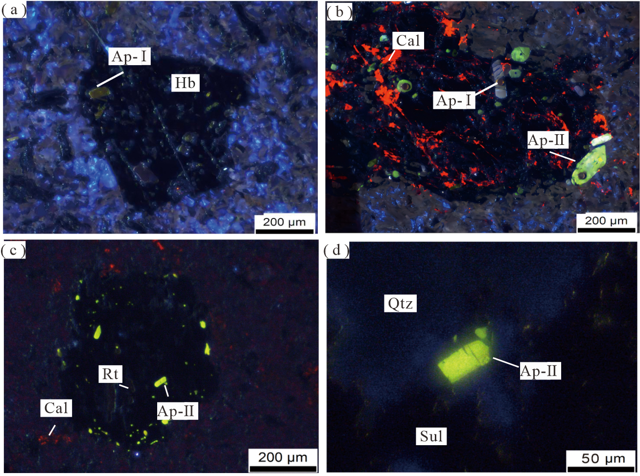 Fig.4 CL images of two types of apatite in the Oubulage Cu-Au deposit Ap—apatite; Hb—hornblende; Cal—calcite; Rt—rutile; Sul—sulfides; Qtz—quartz. (a) CL image of apatite encluded within hornblende; (b) CL image of broken hornblende filled with calcite and apatite; (c) CL image of the paragenetic assemblage of calcite, rutile and apatite; (d) CL image of quartz and apatite distributed in sulfides.