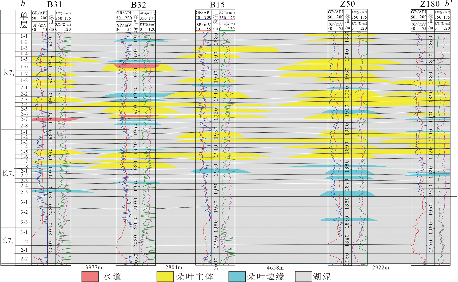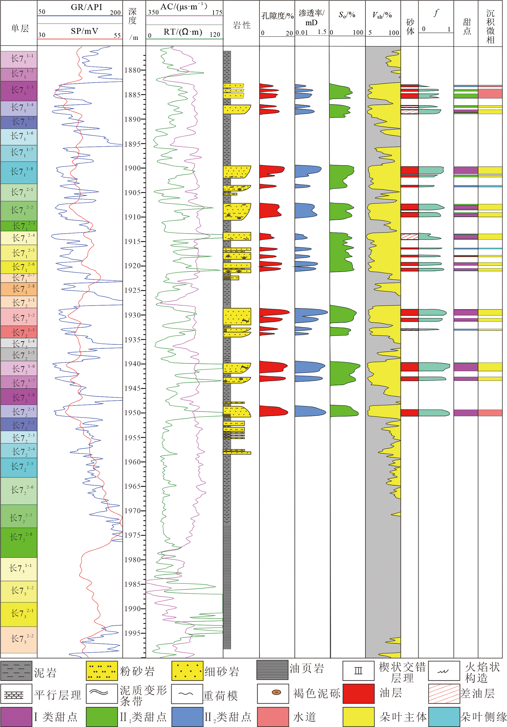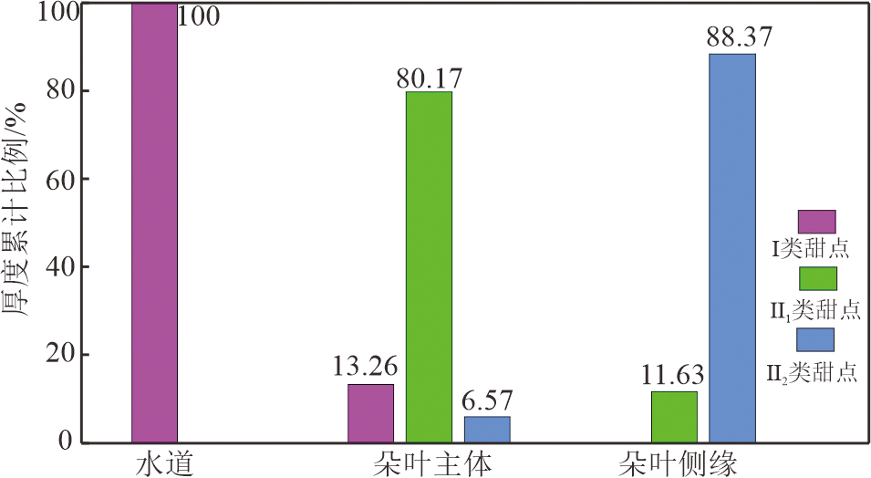 朵叶侧缘 | 细粉砂岩 | 0.5~1.5 m | 无明显韵律 | <6% | >8% | 40%~45% | 小幅度漏斗型或指型 |