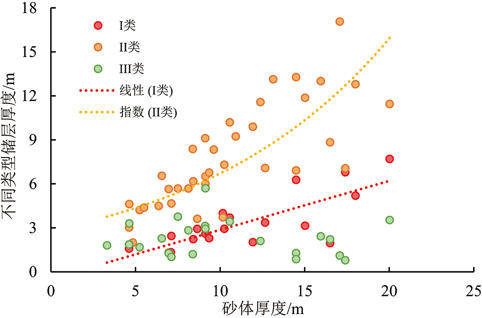 Fig.6 Cross-plot showing the relationship between the thickness of different types of matrix reservoirs and the sandbody thickness of small layers in the Heshui area