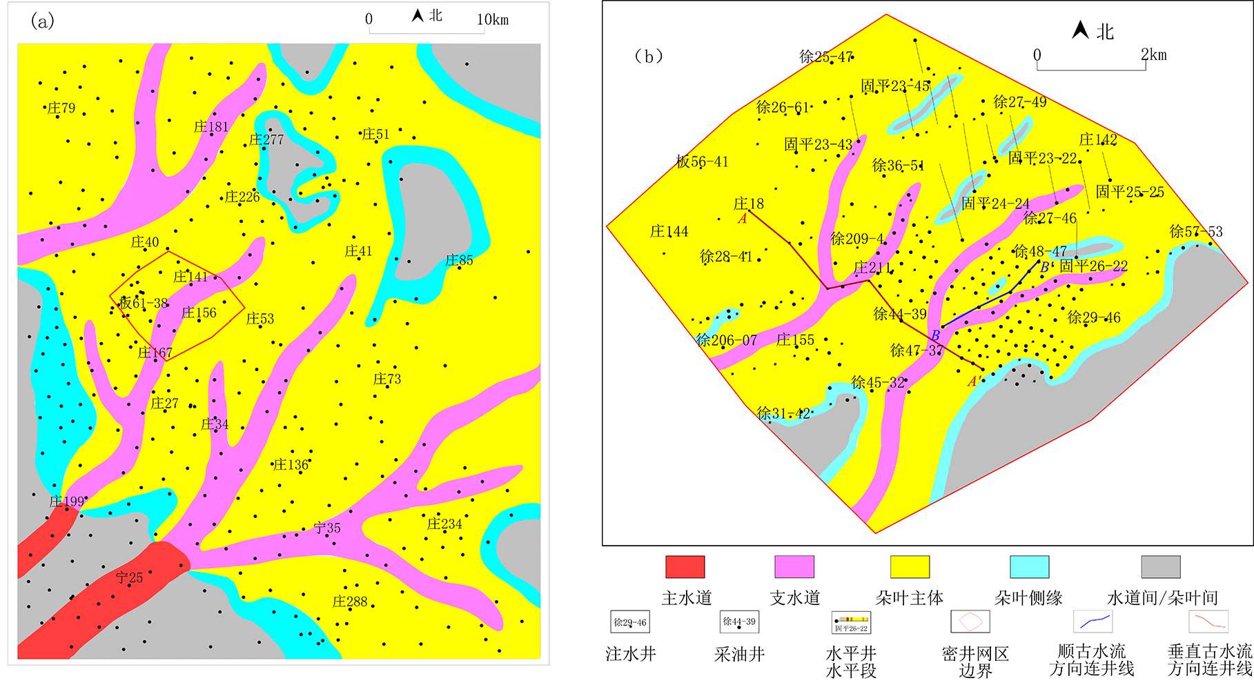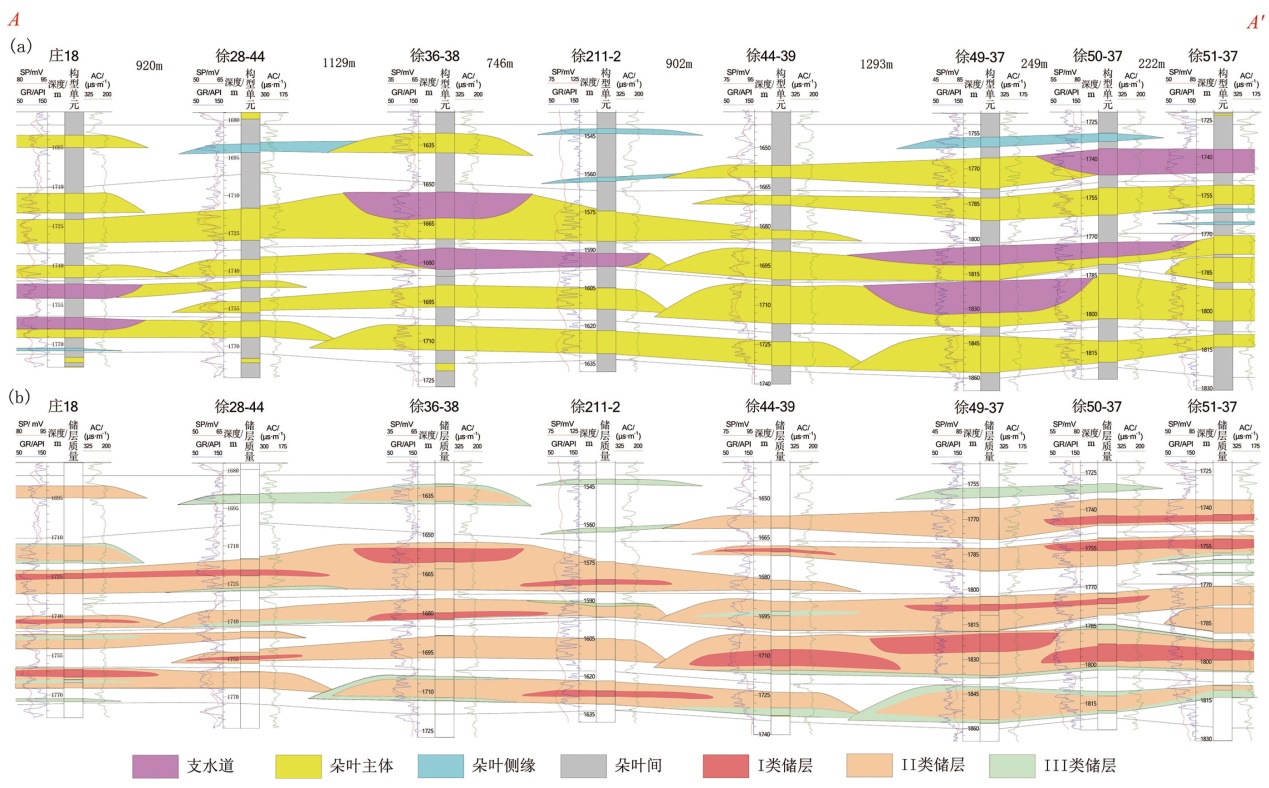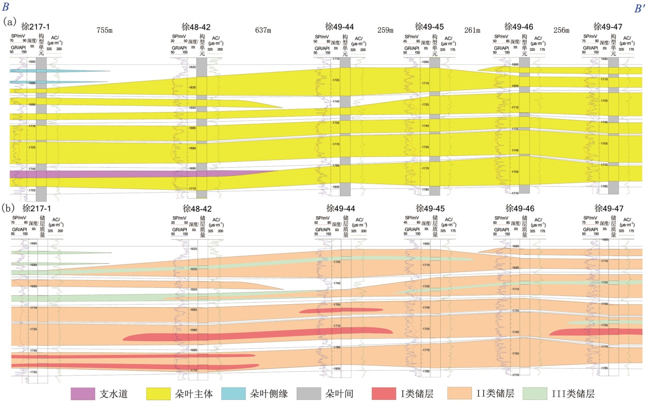 Fig. 8 Profile distribution of the architecture and matrix reservoir quality parallel to the paleocurrent direction in the dense well area of the Heshui area